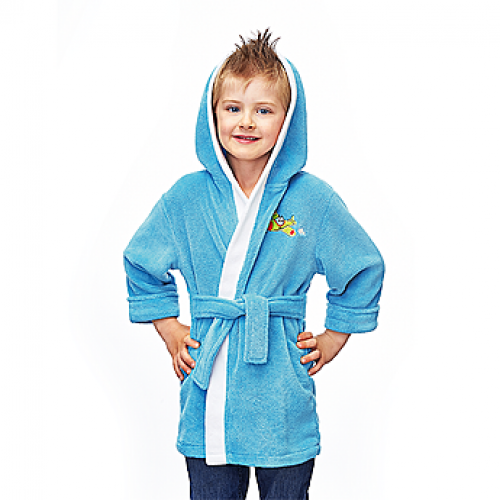 Halat de baie din poliester de culoare albastră, cu aplicaţie haioasă în formă de aeroplan. Margini din bumbac 100% şi glugă confortabilă. 0 *